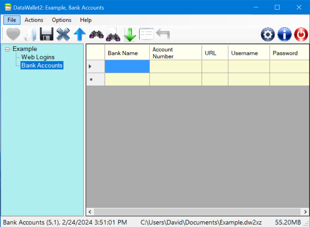 Right-click in the left-hand pane and choose "New Wallet" or choose "New Wallet" from the File menu. Then right-click on the name of the wallet ("New Wallet") and choose "Rename". Finally, save the wallet using "File/Save". You will be prompted for a password or phrase to use for encrypting the file. A new wallet will appear on the left-hand side of the main window with a default dataset describing a collection of web addresses (URLs).