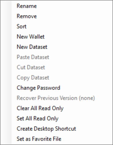 The left-hand wallet pane's context menu allows you to perform basic actions involving single datasets or entire wallet files.