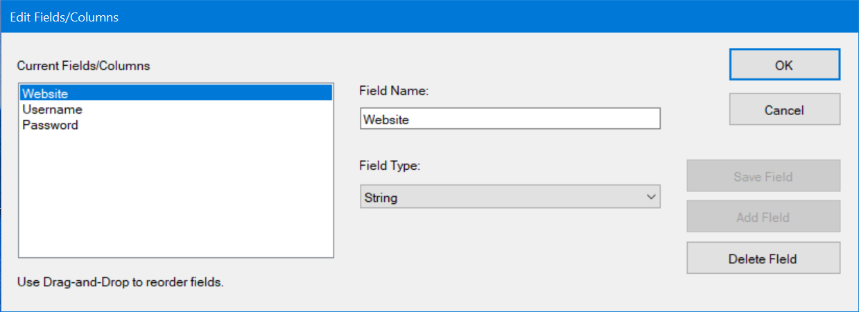 To perform detailed editing of the names and ordering of columns, right-click on the dataset pane and choose "Field Types...". This will reveal the "Edit Field Types" dialog window.