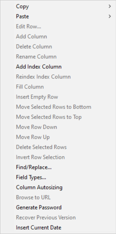Right-clicking on the dataset pane shows the menu for grid operations. Items in the grid menu may be enabled or disabled depending on where you clicked.